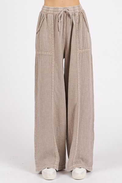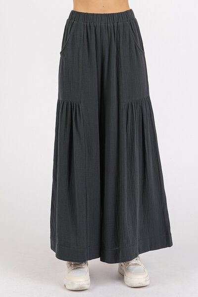Mittoshop Gauze Elastic Waist Pleated Wide Leg Pants